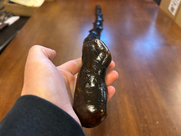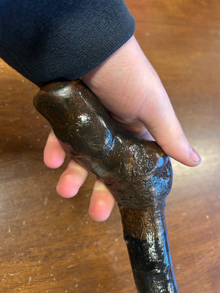 Blackthorn wood has to be seasoned for 2/3 years before it can be hand carved into a walking cane.