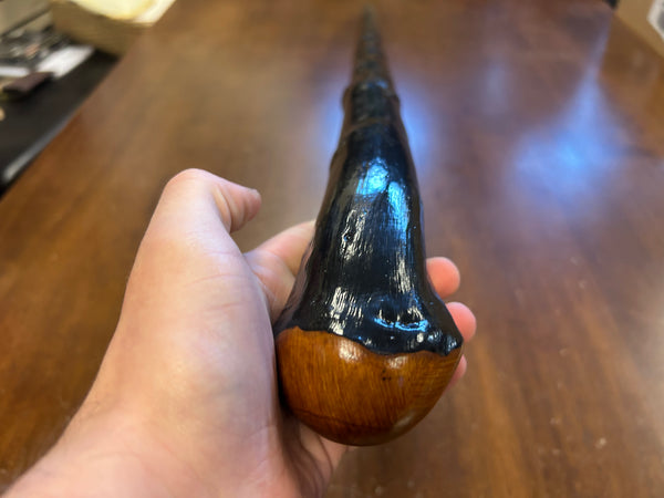 Blackthorn wood has to be seasoned for 2/3 years before it can be hand carved into a walking cane.