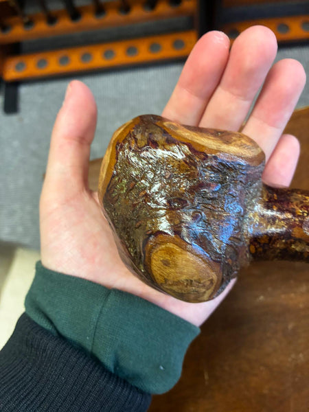 Blackthorn wood has to be seasoned for 2/3 years before it can be hand carved into a walking cane.