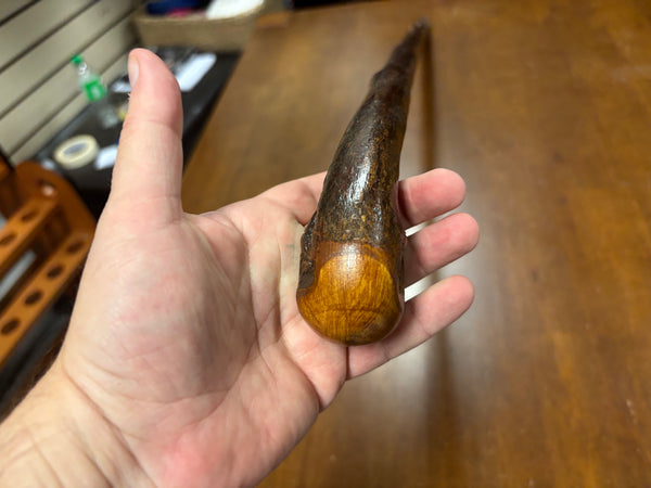 Blackthorn wood has to be seasoned for 2/3 years before it can be hand carved into a walking cane.