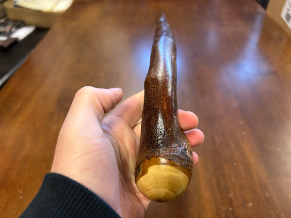 Blackthorn wood has to be seasoned for 2/3 years before it can be hand carved into a walking cane.