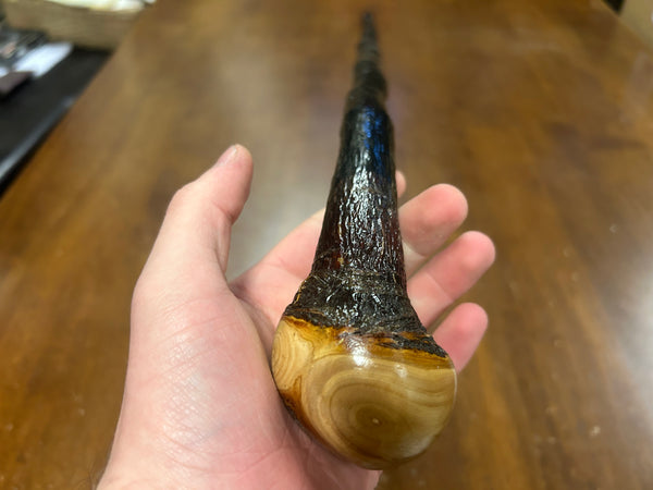 Blackthorn wood has to be seasoned for 2/3 years before it can be hand carved into a walking cane.
