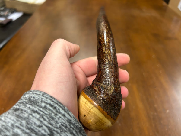 Blackthorn wood has to be seasoned for 2/3 years before it can be hand carved into a walking cane.