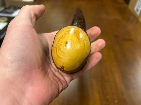 Blackthorn wood has to be seasoned for 2/3 years before it can be hand carved into a walking cane.