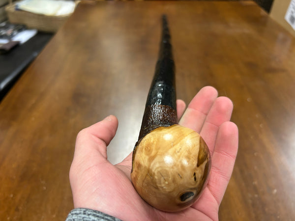 Blackthorn wood has to be seasoned for 2/3 years before it can be hand carved into a walking cane.